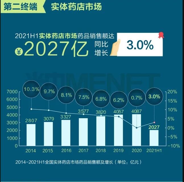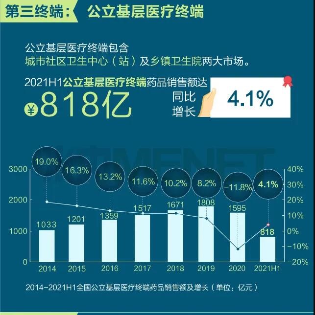 2021年上半年我國(guó)三大終端六大市場(chǎng)(定義范圍詳見文末“數(shù)據(jù)說明”)藥品銷售額達(dá)8393億元,同比增長(zhǎng)8.8%。從實(shí)現(xiàn)藥品銷售的三大終端的銷售額分布來看,公立醫(yī)院終端市場(chǎng)份額最大,2021上半年占比為63.8%;零售藥店終端市場(chǎng)份額2021上半年占比為26.4%;公立基層醫(yī)療終端市場(chǎng)份額2021上半年占比為9.8%。以上統(tǒng)計(jì)數(shù)據(jù)未包含“民營(yíng)醫(yī)院、私人診所、村衛(wèi)生室”。